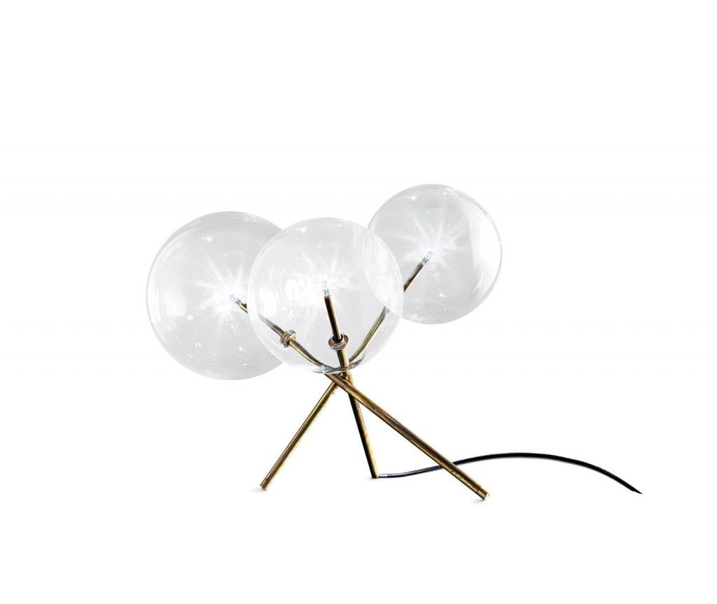 Table lamp with dimmable led light. Transparent blown glass spheres. Metal parts in hand burnished brass. The hand burnished brass finish looks naturally spotted and irregular. Due to this craft made processing, each product is unique and exclusive.