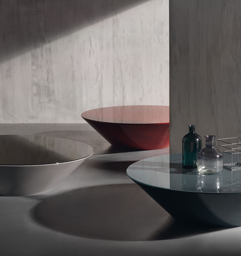 Family of cocktail tables, side tables, occasional tables with different heights and width. While the conical base tends to disappears in the shadow, the top is raised from the ground and lives of intriguing reflections and shades of colours. The reflections of the glass top, whose perfectly glossy surface mirrors everything around, recreating the mystic reflection effect of perfectly still water, or those of the marble top, for the rich grains and mosaic of minerals it is made of. Base made from molded polyurethane BAYDUR60, lacquered with glossy finishes. Top in back-lacquered glass or in stone. 120cm version on wheels, hidden inside the base, removable
