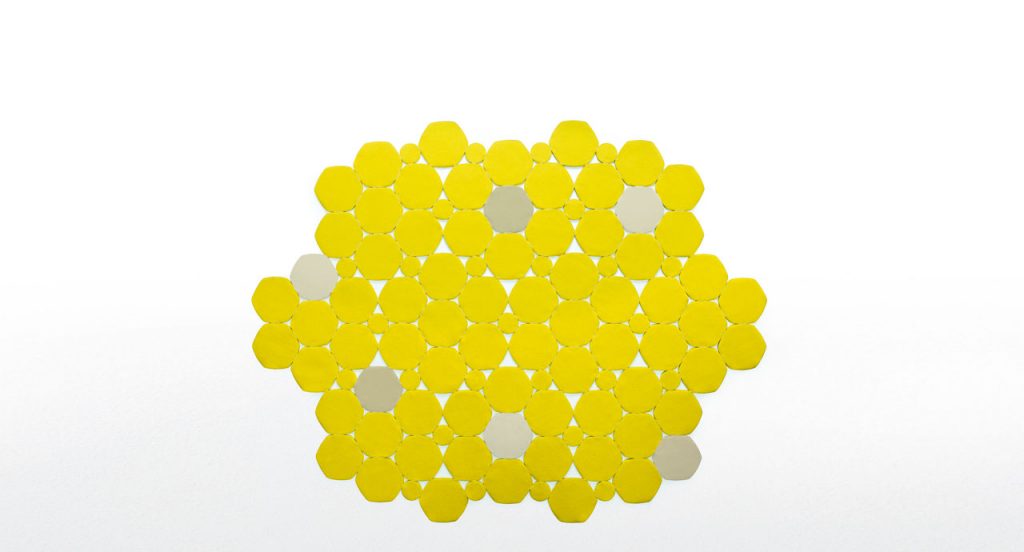 The Prisma rug is created with hexagonal, irregular forms of about cm 30x30 consisting of two layers of felt in the same colour bordered with Punto Pettine with a thread in the same tonality. These elements are then joined together with Punto Rete. To create Prisma rug, it is possible to choose only one colour.